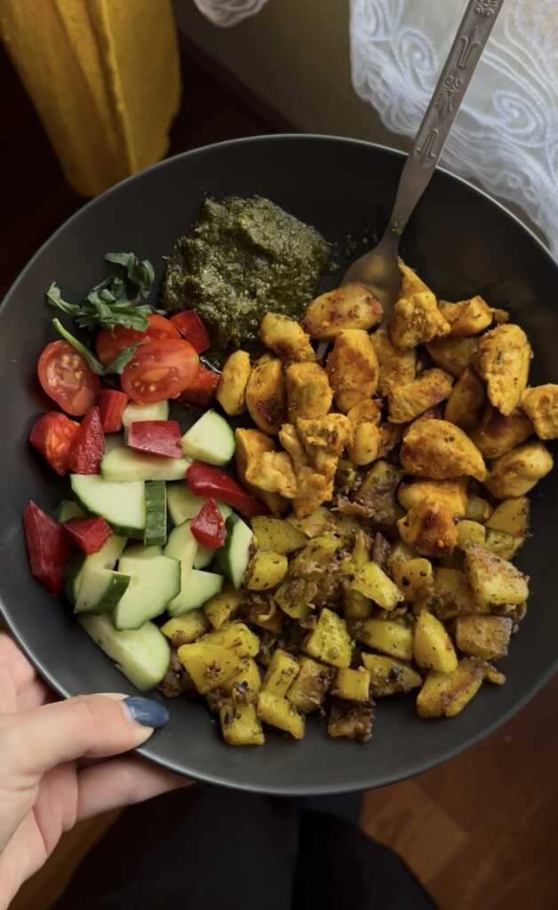 Praetud kartul persillade ja munaga. Lisaks kana, pesto, rukola, tomat, paprika, kurk ja oliiviõli.